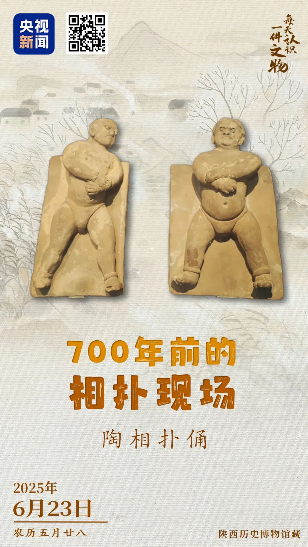 央视新闻联合全国博物馆推出文博科普产品《文博日历》,每天带你认识一件文物。陶相扑佣展现了700年前的相扑现场,角力场上,两位相扑运动者上身赤裸,下身着犊鼻裈(kūn),手腕、脚踝处都缠着护腕和护踝,他们双拳紧握交叉在胸前,牙关紧咬、怒目圆睁,气氛微妙。识别图中二维码查看详情↓