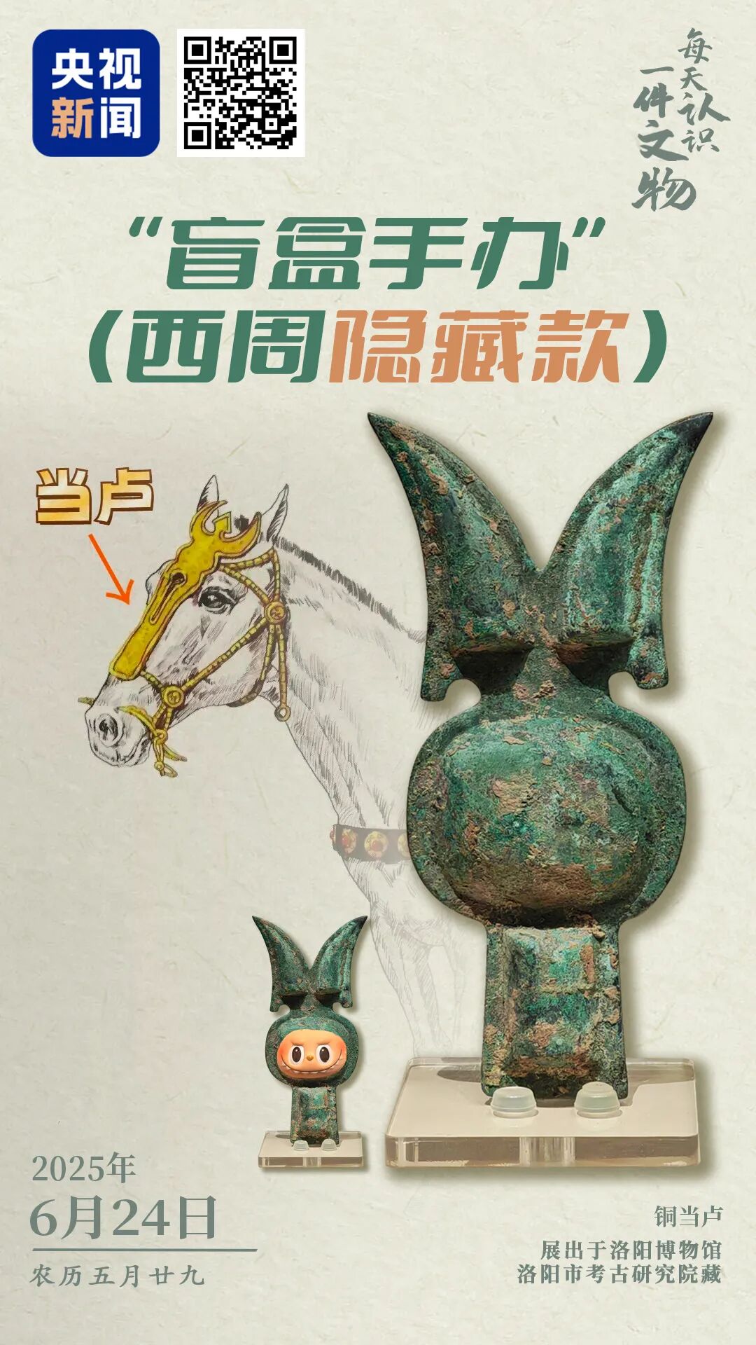 央视新闻联合全国博物馆推出文博科普产品《文博日历》,每天带你认识一件文物。这件西周时期的铜当卢,尖尖的耳朵、圆圆的脑袋、鼓鼓的脸蛋,像极了Labubu本bu。但它既不是手办也不是摆件,而是古代战马专属时尚单品,覆盖于马额中央略上方,可作面具起到一定防护效果,也可作装饰,凸显马主人身份地位的高贵。识别图中二维码查看详情↓