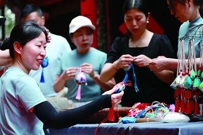 湖北省秭归县屈原故里非遗小巷民间艺人在制作艾叶刺绣香包。王罡摄/光明图片