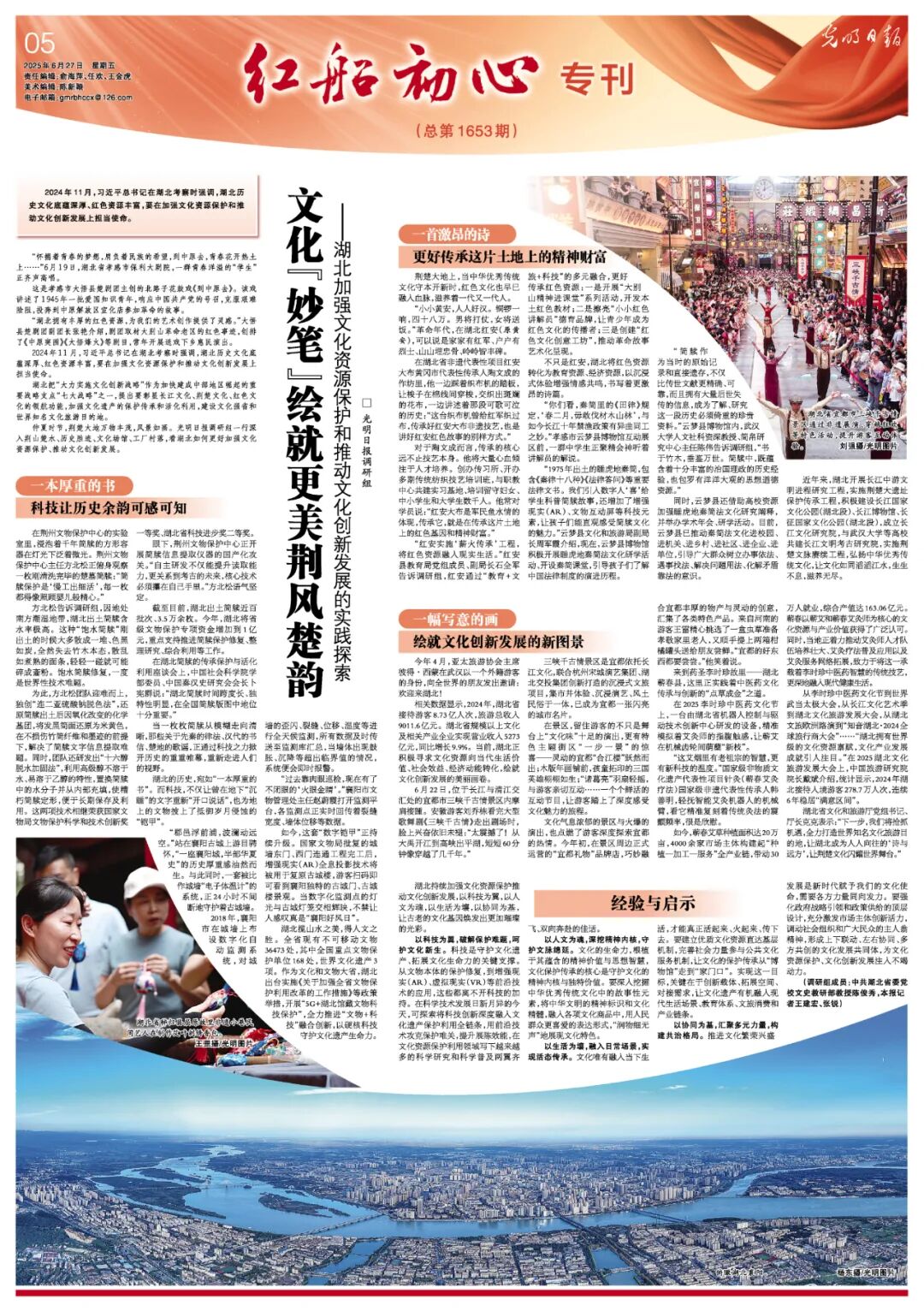 仲夏时节,荆楚大地万物丰茂,风景如画。光明日报调研组一行深入荆山楚水、历史胜迹、文化场馆、工厂村落,看湖北如何更好加强文化资源保护、推动文化创新发展。