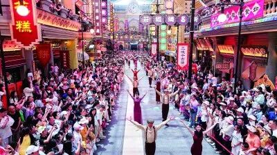 湖北省宜都市三峡千古情景区通过非遗展演、穿越狂欢等特色活动,提升游客互动体验。刘强摄/光明图片