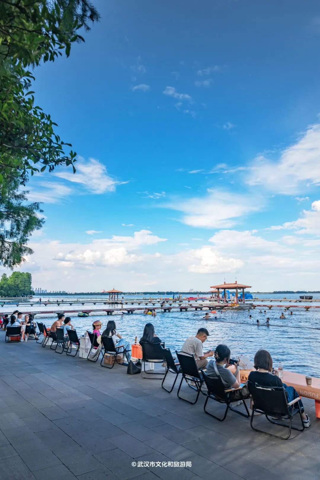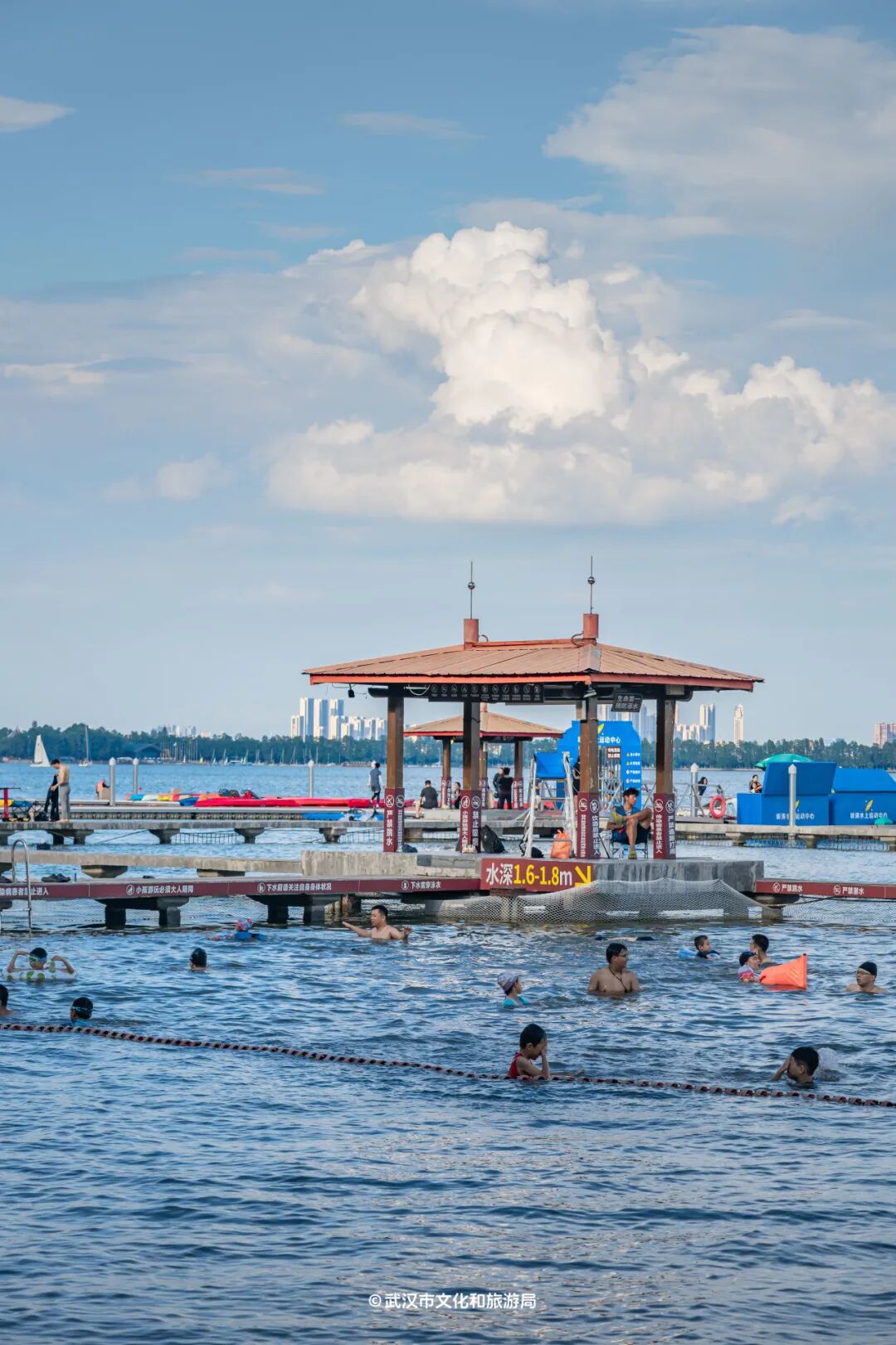 6月27日-8月31日,东湖听涛泳场每天16:00-20:00免费向公众开放。正是舒爽清凉的时段,大朵白云和粉色晚霞做背景,水波随着湖风温柔飘荡,几虚浮啊!