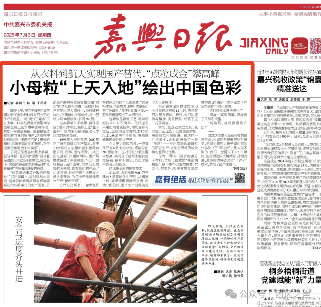 1993年入行的孙侠,2000年在广东东莞建立生产基地,并于2009年成立东莞市金彩色有限公司;同年,他转战海宁成立浙江金彩,仅用时2年生产规模就超越了东莞总部。“化纤、塑料制品、医疗器械、汽车乃至航空航天领域,都有我们的产品。”30多年来,孙侠带领企业研发人员从零开始,为每个产品破译高分子级“着色密码”。