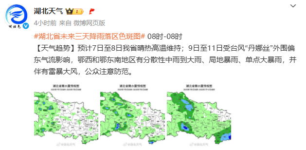 9日至11日受台风“丹娜丝”外围偏东气流影响,鄂西和鄂东南地区有分散性中雨到大雨、局地暴雨、单点大暴雨,并伴有雷暴大风,最高气温降至32~37℃。