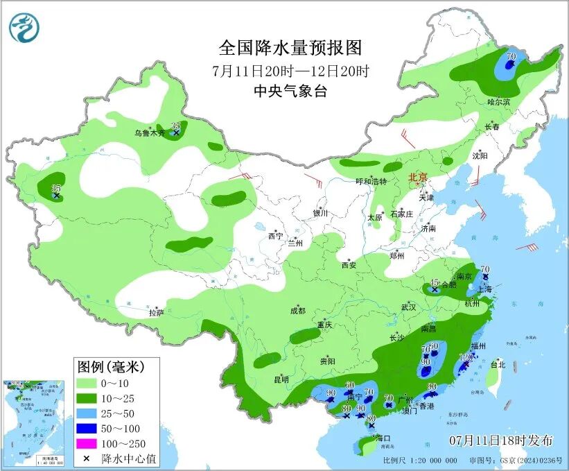 中央气象台11日18时继续发布暴雨蓝色预警:预计11日20时至12日20时,福建东部沿海和西南部、广东东部和南部、广西中南部、云南东南部、海南岛、江西南部、上海、江苏南部、浙江北部和东南部、安徽南部以及黑龙江中西部、新疆沿天山地区等地部分地区有大到暴雨,其中,福建东部沿海局地有大暴雨。