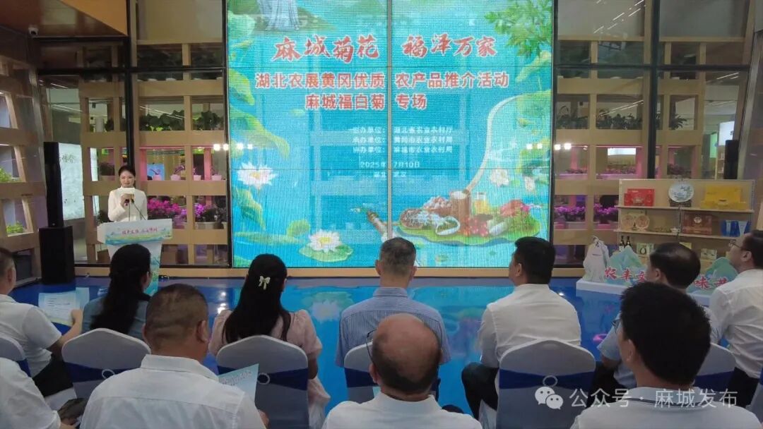 麻城市菊花品牌推介人以“麻城菊花产业写给天地与人的情书”为主题,深入阐释麻城福白菊的千年文化底蕴与现代价值,讲述菊花助力乡村振兴的典型故事。5家菊花生产企业代表分别介绍企业运营、产品特性及转型升级等情况。目前,福白菊产品已打入国际市场,现场展示的菊亮亮蒸汽热敷眼罩、菊花聚维酮碘口腔喷雾剂、菊花固体饮料等爆款新品,彰显了产业创新与科技创新的深度融合。