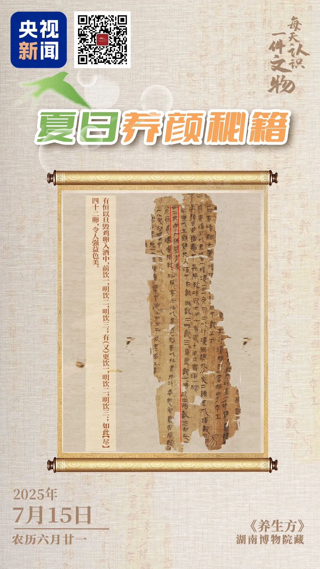 马王堆利豨(xī)墓出土的帛书《养生方》,是中国现存最古老的养生专著,收录80多个古方,包括抗衰老、强体力、美容黑发等,堪称西汉版“养生宝典”。其中一款“甜酒冲鸡蛋”的养颜方,延续了2000年,至今仍是湖南的名小吃。