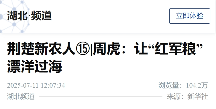 在湖北红安的大别山深处,周虎在这里创业9年,带领团队攻克“红安苕”的保鲜储存难题,并实现从卖鲜薯到研发红薯生全粉等多种产品的跨越。他更大的梦想,是让这口“红军粮”漂洋过海,从大别山走向世界。