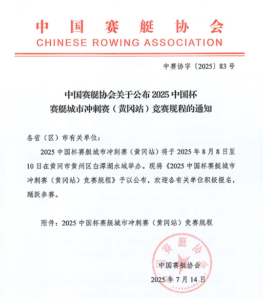 根据中国赛艇协会通知,2025中国杯赛艇城市冲刺赛(黄冈站)将于8月8日至10日在黄冈市黄州区白潭湖水域举办。8月2日至10日,2025中国杯赛艇城市冲刺赛(黄冈站)暨黄冈白潭湖首届潮玩文化节将在黄州区白潭湖水域盛大开启,300余名全国赛艇精英逐浪而来,7天潮玩狂欢、2天巅峰对决、N种惊喜体验,邀您共赴这场 "水上盛宴"!