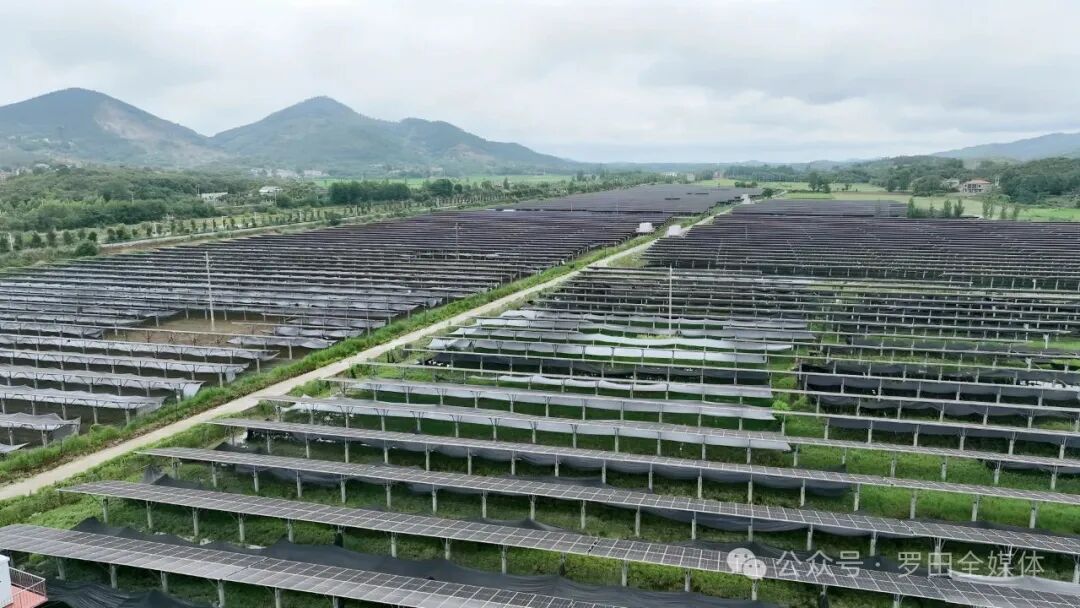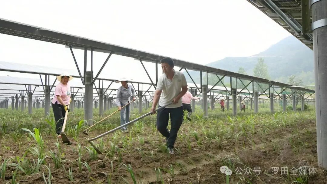 雨后的大崎镇李婆墩村,空气清新,绿意盎然,一块块中药材基地在光伏板下纵横铺展。村民们趁着雨水间歇期,忙着清沟除草。
