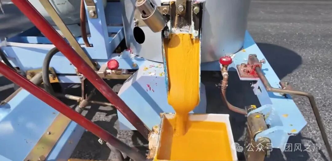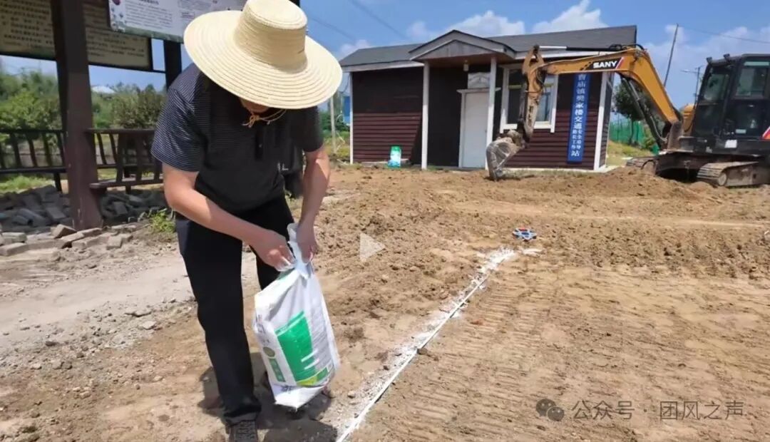 烈日当空,在马曹庙镇的交通驿站,施工人员汪擂线正专注地将洁白的石灰粉撒向路面,为后续的标线施工做准备。汗水早已浸透了他的工装。