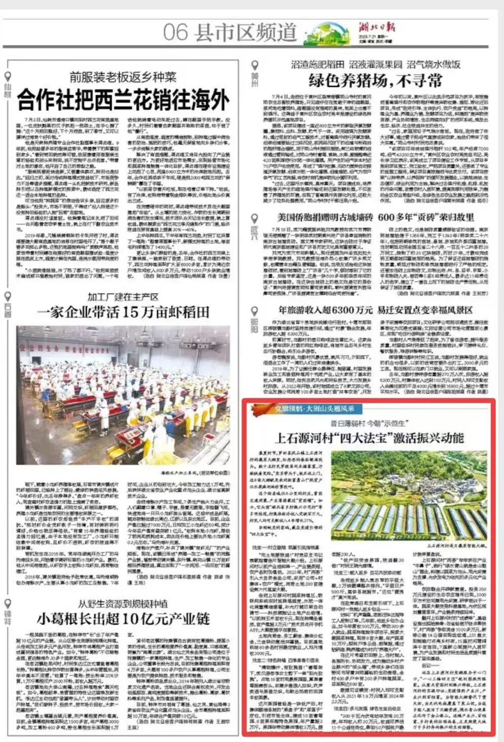 7月21日,湖北日报“党旗领航 大别山头雁风采”栏目报道了罗田县凤山镇上石源河村凭借党建引领的 “四大法宝”:村企联姻建智能大棚、特色种植兴采摘、能人返乡带产业、多元发展强后劲,实现村集体经济超百万,村民收入4年增21%,成为“湖北省乡村振兴示范村”,绘就乡村振兴画卷。