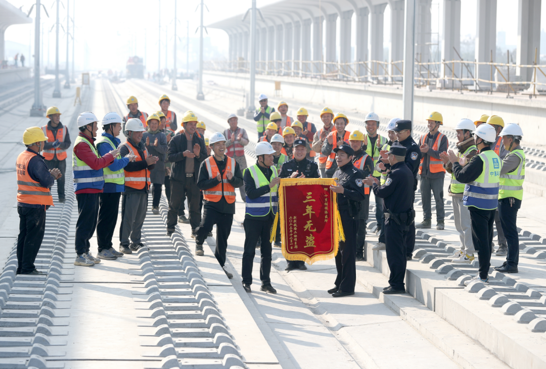 2023年12月,荆荆高铁十里铺段竣工时,项目负责人将一面印有“三年无盗”几个大字的锦旗送到十里铺派出所。这面锦旗背后,是6名“项目警长”与村干部组成的“6+6”联动小组,三年如一日驻守工地,将矛盾化解在前端、安全监管在一线创造的零发案奇迹。