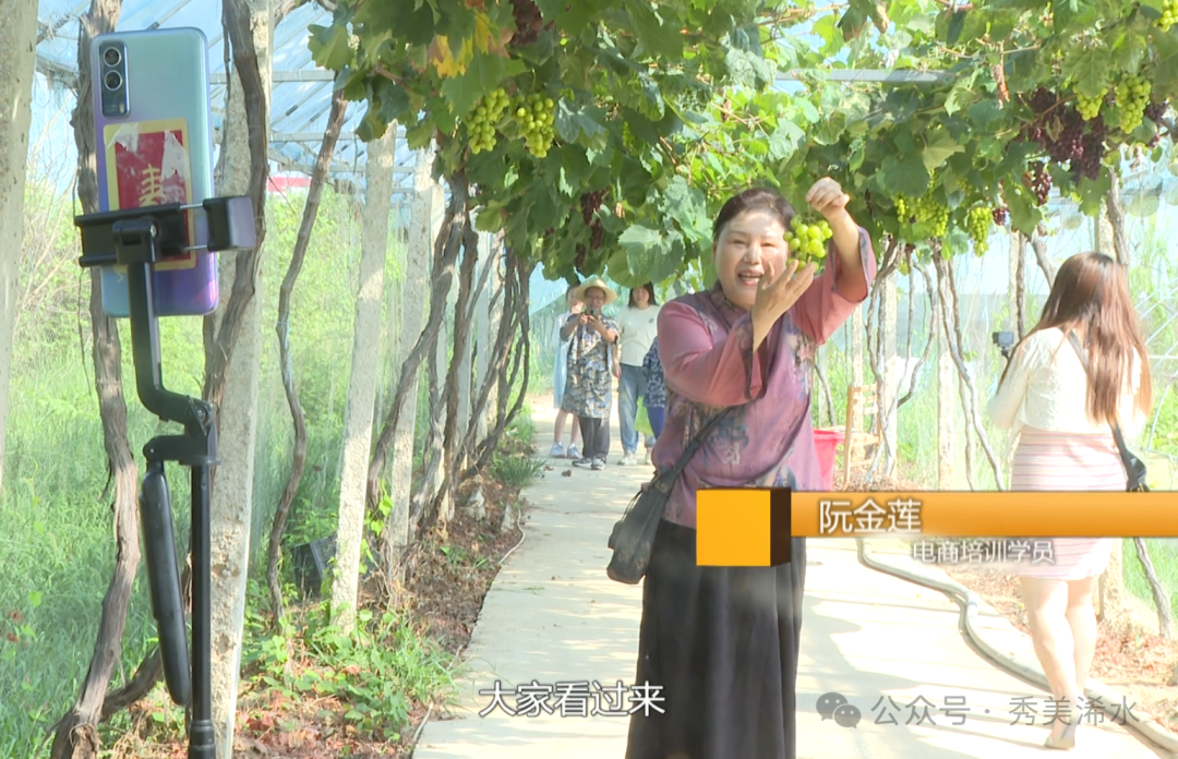 活动现场,清晨六点,不少培训学员专程驱车赶来,边采摘边拍照。电商培训学员阮金莲正通过直播热情推介。