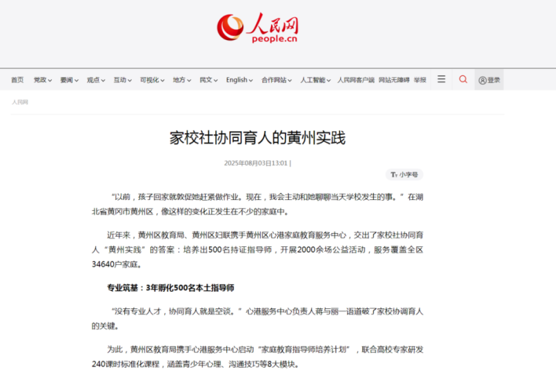 8月3日,人民网以《家校社协同育人的黄州实践》为题重点报道了黄州区家庭教育指导工作和经验。