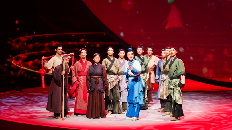方言塑造戏曲的艺术特色。戏曲的旋律要求“依字行腔”。方言的声调、语调、节奏、韵律直接决定了戏曲音乐的旋律走向和念白的独特韵味。地方戏曲声腔的丰富性来自方言的复杂性。方言不同,字的调值不同,必然造成声腔、旋律的变异。京剧的昂扬激越离不开北京话语音的特点,单就声调来说,北京话只有阴平、阳平、上声、去声四个声调,字音与字音之间调值有较大差距,故声调跳跃性较大,戏曲唱腔就有高亢洪亮、抑扬顿挫的特点;黄梅戏的江南风味离不开方音的特殊音系。吴语的声调对越剧的声腔有着深远的影响,吴语继承了中古汉语的四声和清浊对立,后来根据声母的清浊不同,分化为八个声调,即阴阳平、阴阳上、阴阳去、阴阳入。这种丰富的声调系统为越剧的声腔提供了独特的音韵基础。形成了越剧的唱腔以软糯婉转、细腻抒情为主,其旋律的起伏和音调的变化与吴语的声调特点密切相关。吴语的声调变化使得越剧在表达情感和描绘场景时更加生动和细腻,具有独特的艺术魅力。