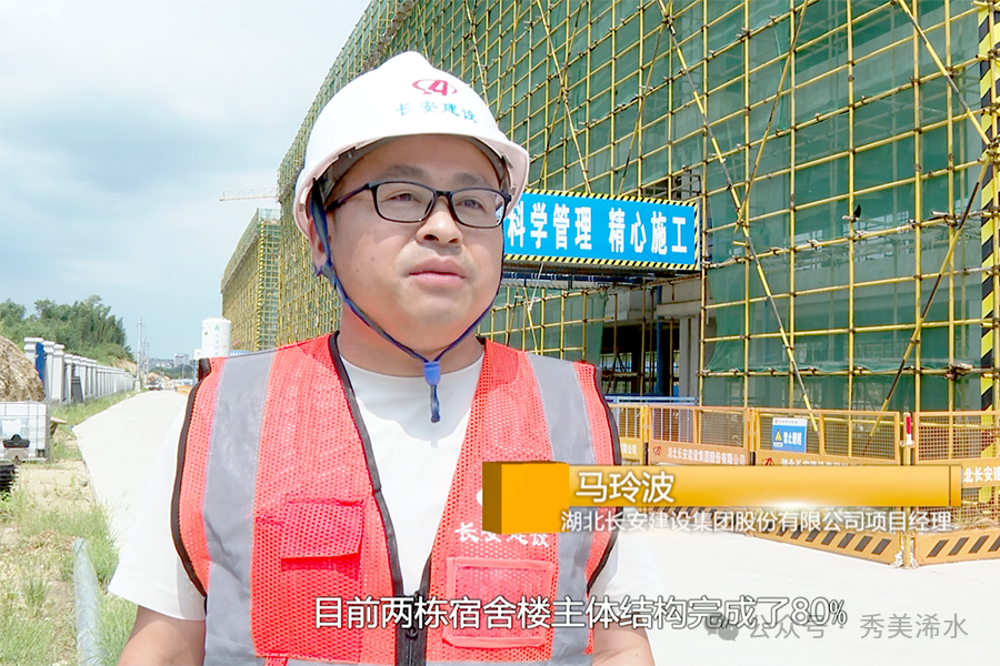 湖北长安建设集团股份有限公司项目经理 马玲波:现场有大型机械设备20台,施工人员约210人。目前两栋宿舍楼主体结构完成了80%,计划12月底完成装修。三栋教学楼装机完工,计划12月底主体结构封顶。整个项目照时间节点稳步推进。