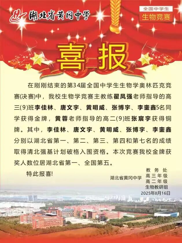 本次竞赛黄冈中学金牌获奖人数位居湖北省第一、全国第五,强势领跑!