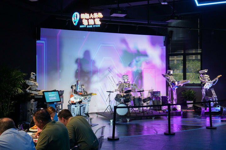 在位于北京经开区的“机器人焰究所”主题餐厅内,机器人乐队在进行表演(2025年8月6日摄)。新华社记者 鞠焕宗 摄