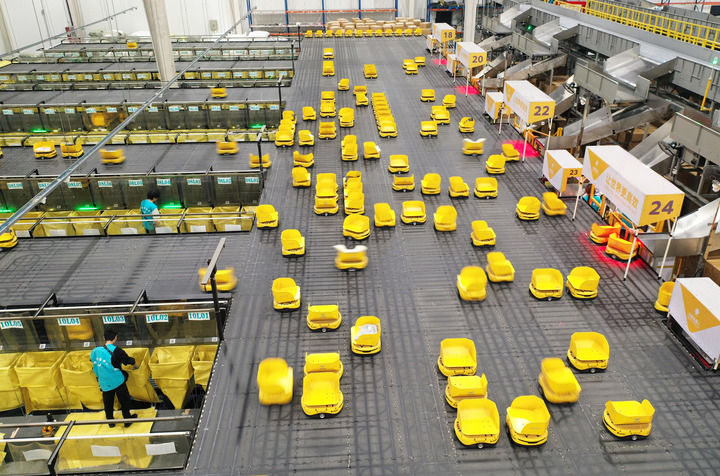浙江省湖州市德清县乾元镇第一产业智慧物流园区快鱼服饰有限公司华东物流中心,800余台分拣“小黄人”机器人在精准配送各类服饰(无人机照片,2024年11月7日摄)。新华社发(倪立芳摄)