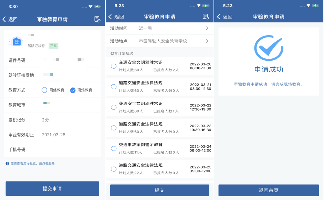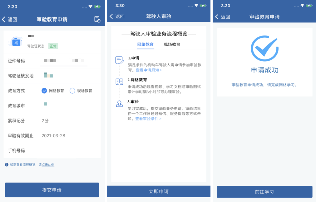 1.在线申请:下载“交管12123”手机App。注册登录后,在首页点击“更多”进入“业务中心”。在“学习教育业务”中选择“驾驶人审验”进行在线办理。