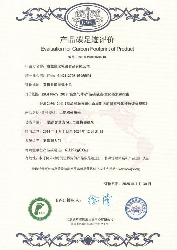 “二度梅佛缘米”作为“江汉大米”和黄冈地标优品的佼佼者,此次获得碳足迹认证,是康宏粮油贯彻湖北农发集团绿色低碳理念的生动实践。碳足迹涵盖产品从原料到废弃全生命周期的碳排放总量,是衡量产品环境影响的标尺。该公司将低碳发展融入粮食生产全链条,推动绿色转型。