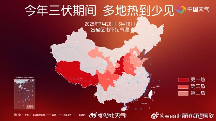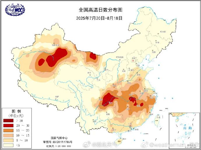 今年三伏期间,新疆多地、内蒙古西部、四川、重庆、陕西中南部、山西南部、河北南部、山东、江苏北部、安徽大部、湖北、江西北部、湖南大部、广西大部、海南的高温日数偏多。
