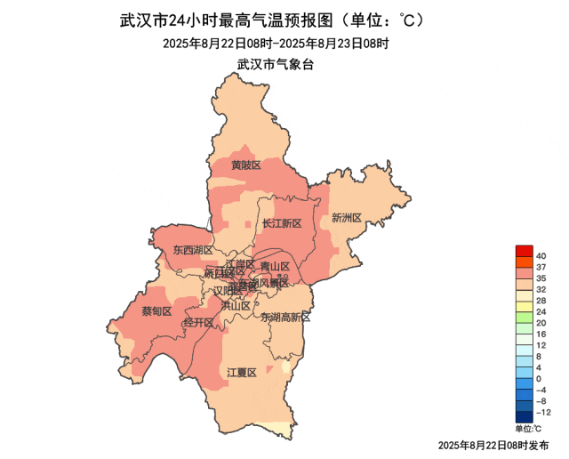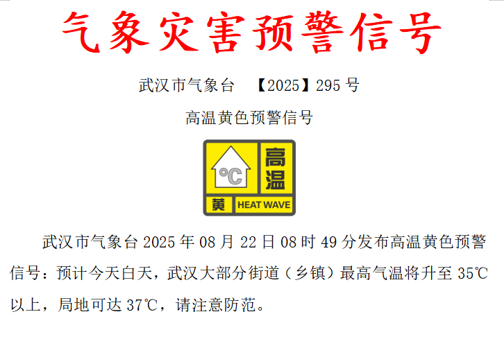 今天(22日)早上武汉市气象台继续发布高温黄色预警信号预计武汉大部分街道最高气温将升至35℃以上局地可达37℃提醒公众要防暑降温