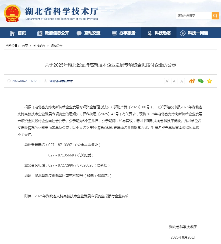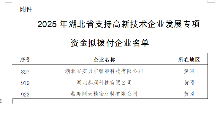 近日,《湖北省2025年支持高新技术企业发展专项资金拟拨付企业名单》正式公布,蕲春县安贝尔智能科技、恭润科技和蕲春顺天精密等3家企业凭借突出的研发实力和创新成果成功入选。这不仅是对企业自身创新发展的高度认可,更是蕲春大力实施创新驱动发展战略、推动高新技术产业高质量发展的有力见证。