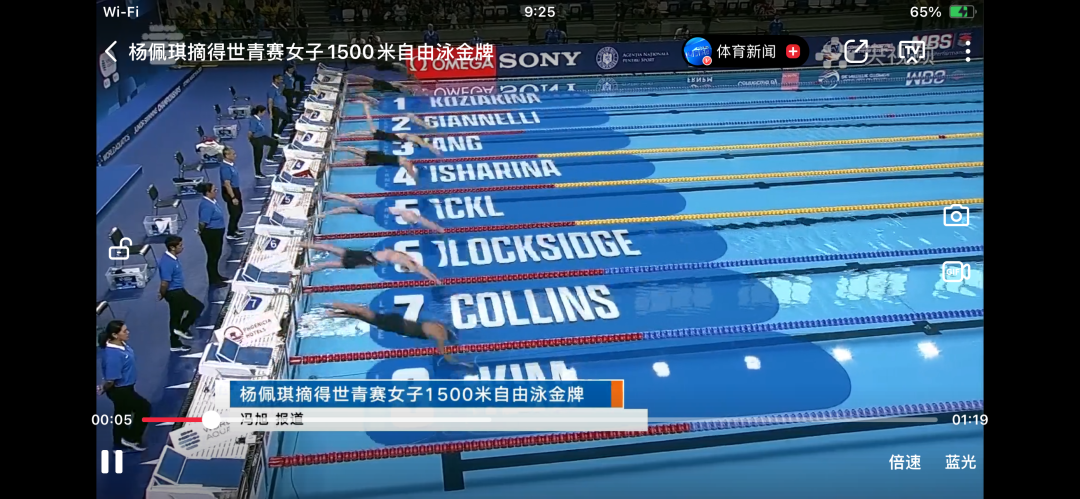 女子1500米自由泳决赛,杨佩琪在第3道出发,全程与第4道中立选手米莎莲娜交替领先,最后100米杨佩琪猛加速发起冲刺,很快甩开对手约3个身位,以无人能敌的气势到边,成绩是16分08秒37。