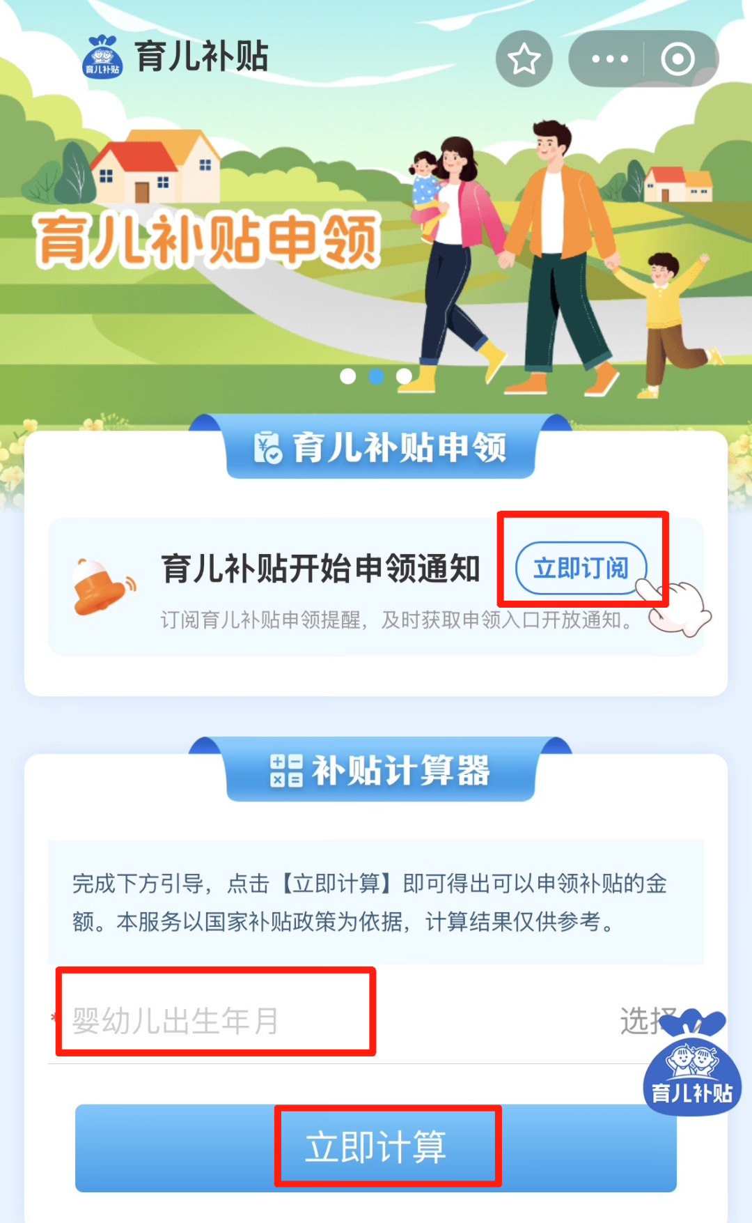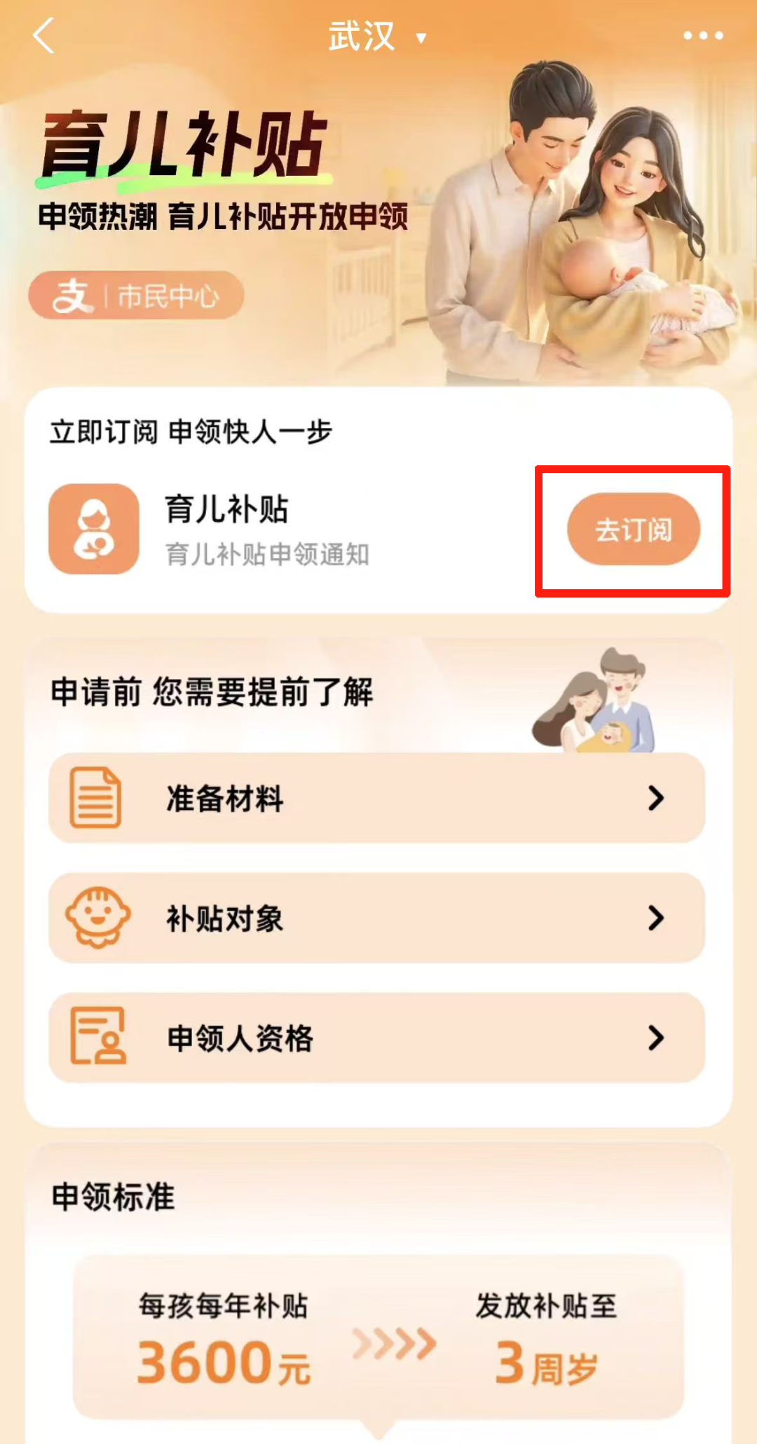 点击【育儿补贴】旁边的【去订阅】