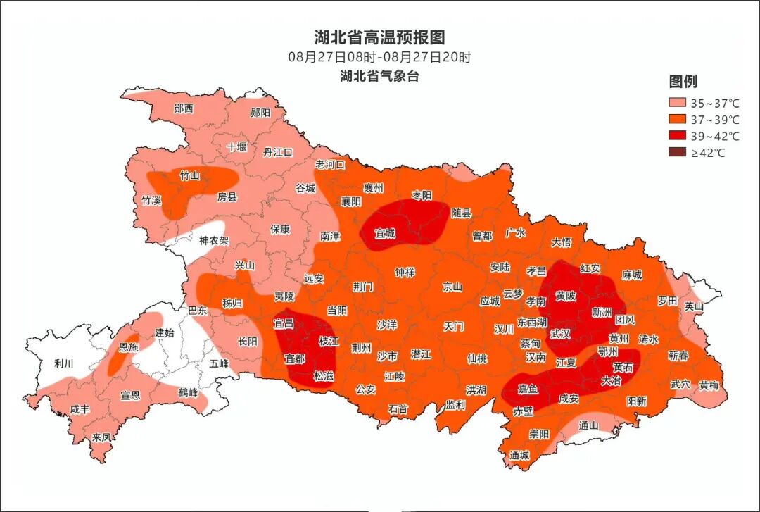 湖北省气象台2025年8月26日15时56分发布高温橙色省级预警:预计27日白天,除鄂西山区外,湖北省大部分地区最高气温将升至37℃以上,局地39℃以上,请注意防范。