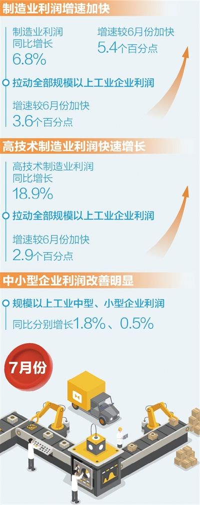 高技术制造业利润快速增长,引领作用明显。7月份,高技术制造业利润由6月份下降0.9%转为增长18.9%,拉动全部规模以上工业企业利润增速较6月份加快2.9个百分点,引领作用明显。其中,航空航天器及设备制造行业利润增长40.9%,生物药品制造、化学药品制剂制造等行业利润分别增长36.3%、6.9%。