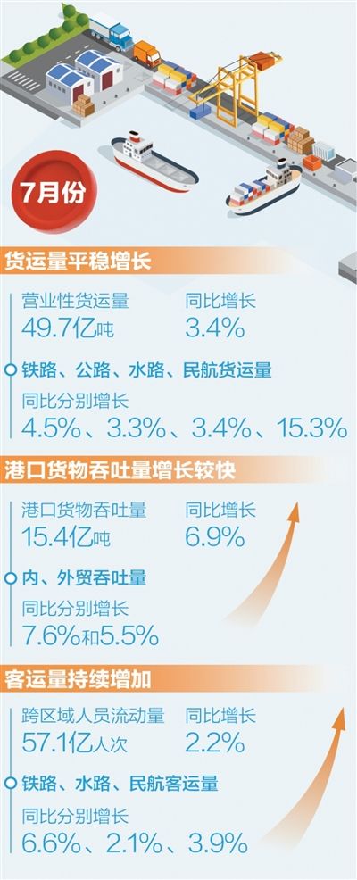 货运量保持平稳增长。7月份,完成营业性货运量49.7亿吨,同比增长3.4%,增速较上月回升0.5个百分点。分方式看,铁路、公路、水路、民航货运量同比分别增长4.5%、3.3%、3.4%、15.3%。1至7月,完成营业性货运量330亿吨,同比增长3.8%。