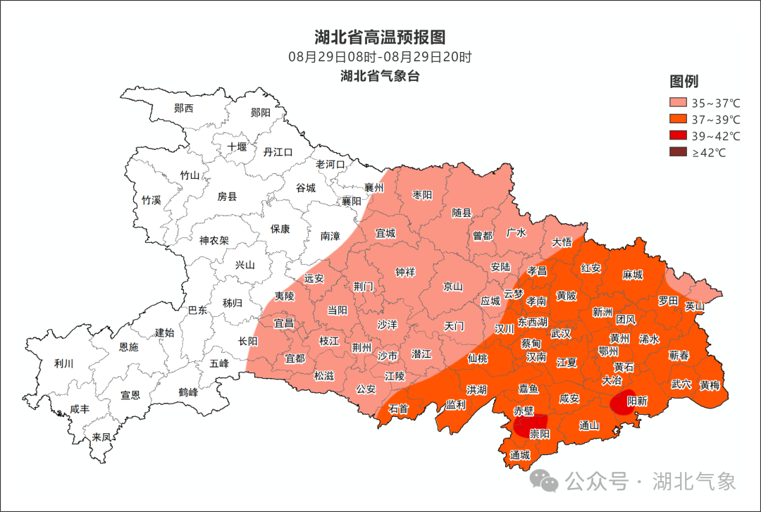 预计29日白天,襄阳东部、宜昌东部、随州、荆门、荆州、天门、仙桃、潜江、孝感、武汉、鄂州、黄冈、黄石、咸宁等地最高气温将升至35℃以上,其中孝感、仙桃、荆州东部、武汉、鄂州、黄冈、黄石、咸宁等地可达37℃以上,局地39℃以上,请注意防范。