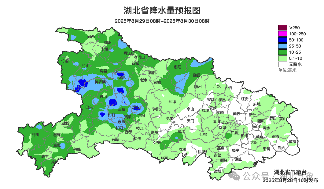 8月29日08时--30日08时,鄂西北、鄂西南、江汉平原西部、鄂东北西部多云到阴天有小到中雨,局地大雨或暴雨;其他地区晴天到多云,有分散性阵雨或雷阵雨。省内局地有短时强降水和雷暴大风。最高气温鄂西北30~34℃、其他地区35~39℃、局地40℃以上,最低气温西部22~25℃、中东部25~28℃,偏北风2到3级。