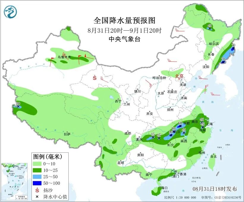 中央气象台预计,8月31日20时至9月1日20时,新疆阿勒泰和沿天山地区、西藏西部、吉林东部、辽宁东部、重庆东南部、湖北东部和南部、湖南北部和东部、江西北部和西部、安徽中南部、江苏南部、浙江北部、上海、福建中北部、广东西南部、海南岛、云南西部等地的部分地区有中到大雨,局地有暴雨。
