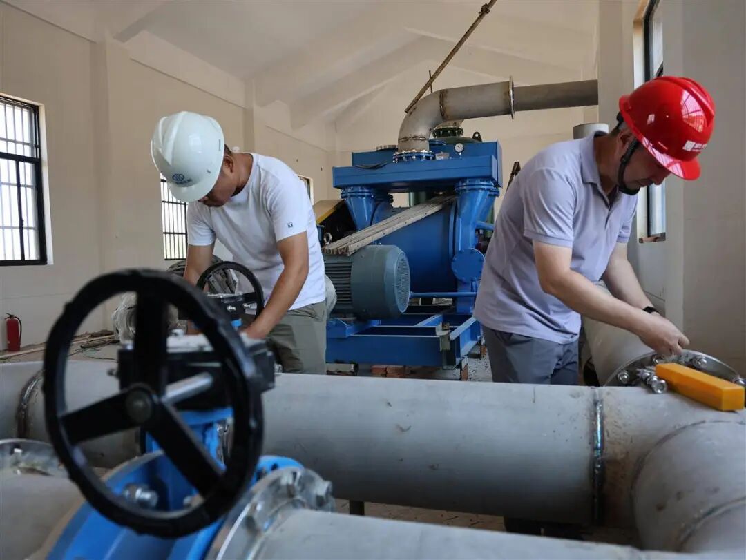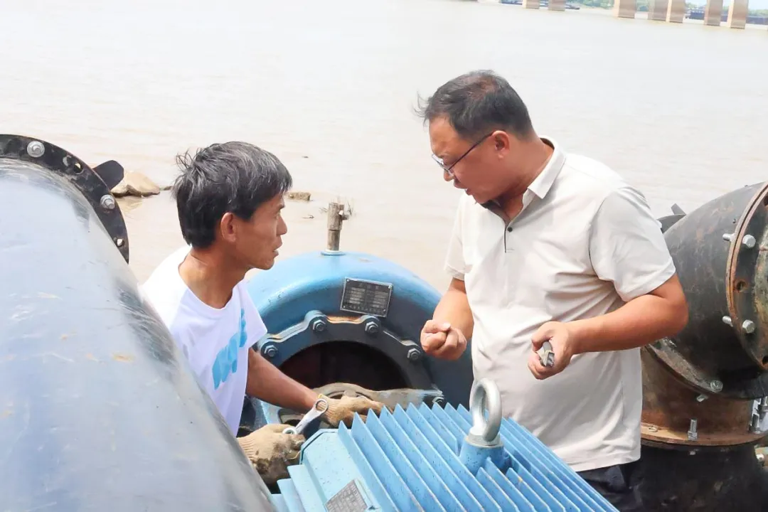 8月26日中午1点,黄梅县刘佐乡长江大堤,八一泵站更新改造施工现场暑气袭人,正在安装设备的技工们汗透衣裳。