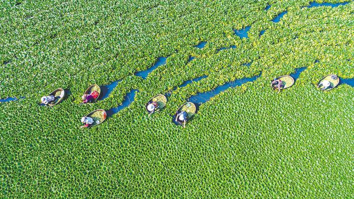 在“85后”回乡能人张剑雄的带领下,天井湖村种植了6000亩菱角。 (湖北日报通讯员 袁杰 摄)