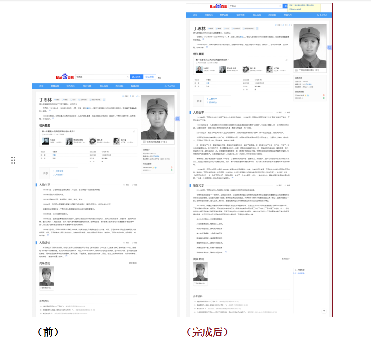烈士丁思林百度词条前后对比(左为之前,右为修改完善后)