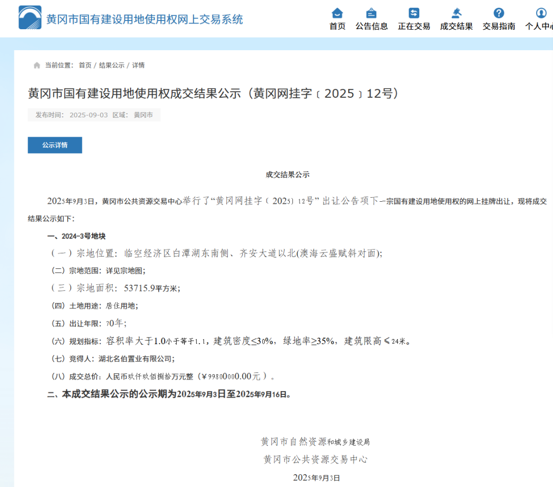 9月3日,黄冈市临空经济区2024-3号地块通过市公共资源交易中心官网完成挂牌摘牌,以9980万元成交总价为区域高质量发展再添新动能。该地块的顺利出让,标志着临空经济区在完善城市功能、提升人居品质方面迈出坚实一步。