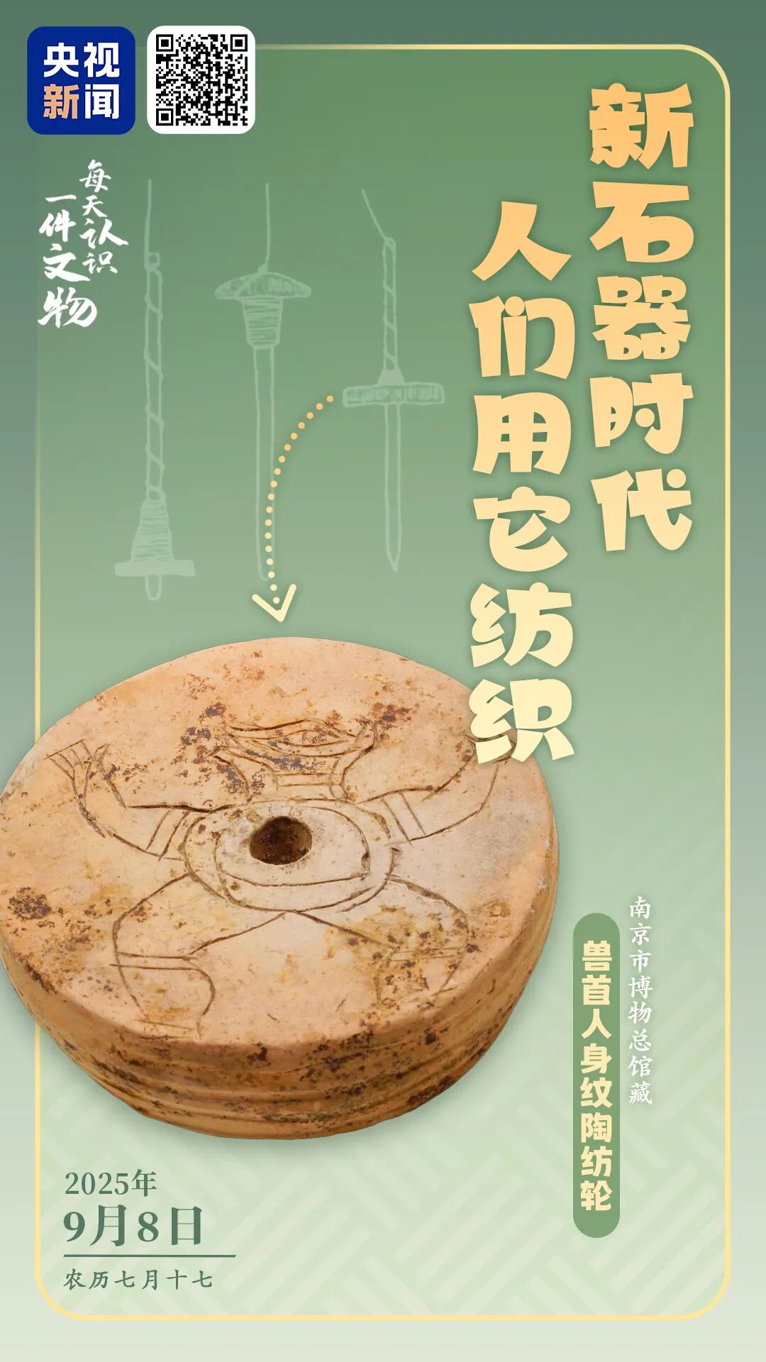 天渐渐凉了,该慢慢把厚衣服拿出来了。远古时期的人们穿什么样的衣服?他们的衣服又是如何制作出来的?出土于江苏省南京市的兽首人身纹陶纺轮由灰陶制成,上面浅刻一个兽首人身的纹饰,线条简洁流畅,形象栩栩如生,展现了新石器时代“南京人”的审美。
