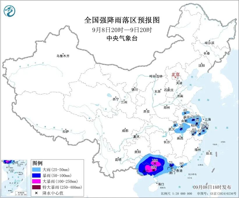 中央气象台8日18时继续发布暴雨黄色预警,预计8日20时至9日20时,广西中东部、广东西部部分地区有大暴雨,局地特大暴雨;江苏南部、安徽、浙江、江西北部、湖北东部、湖南南部等地的部分地区有分散性大雨或暴雨。