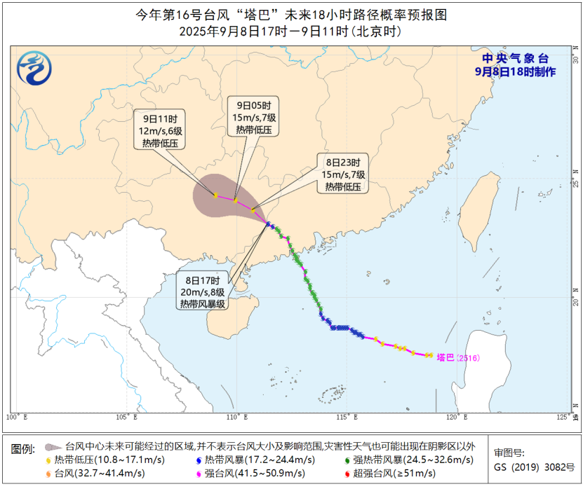 中央气象台8日18时发布台风蓝色预警,今年第16号台风“塔巴”已减弱为热带风暴级,预计“塔巴”将以每小时15—20公里的速度向西北方向移动,即将移入广西境内,并逐渐减弱为热带低压。