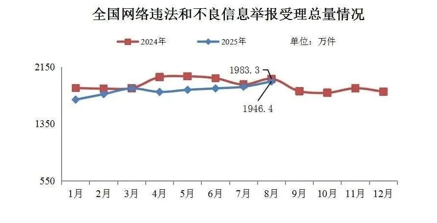 中央网信办举报中心9月10日公布的数据显示,2025年8月,中央网信办举报中心指导全国各级网信举报工作部门、主要网站平台受理网民举报色情、赌博、侵权、谣言等违法和不良信息1946.4万件,环比增长3.9%、同比下降1.9%。