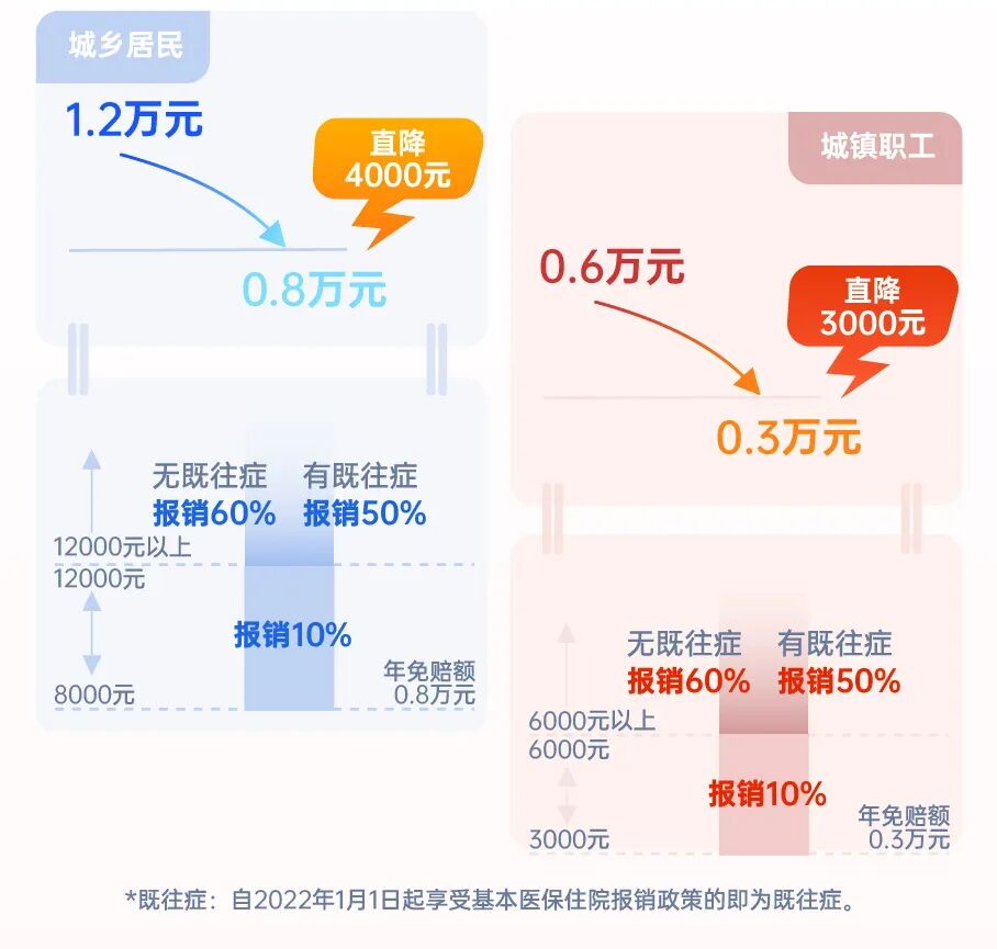 大幅降低医保政策范围内合规费用年免赔额,城镇职工由6000元降至3000元,城乡居民由12000元降至8000元,理赔门槛更低,让更多参保群众受益。