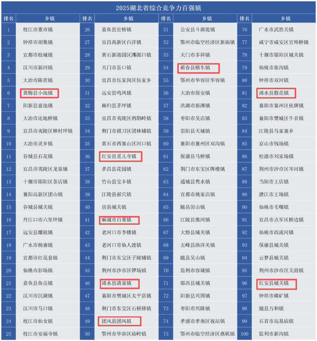近日,竞争力智库、北京中新城市规划设计研究院等机构联合发布《湖北省乡镇综合竞争力报告2025》揭晓。在“2025湖北省综合竞争力百强镇”名单中,黄冈8个乡镇上榜。