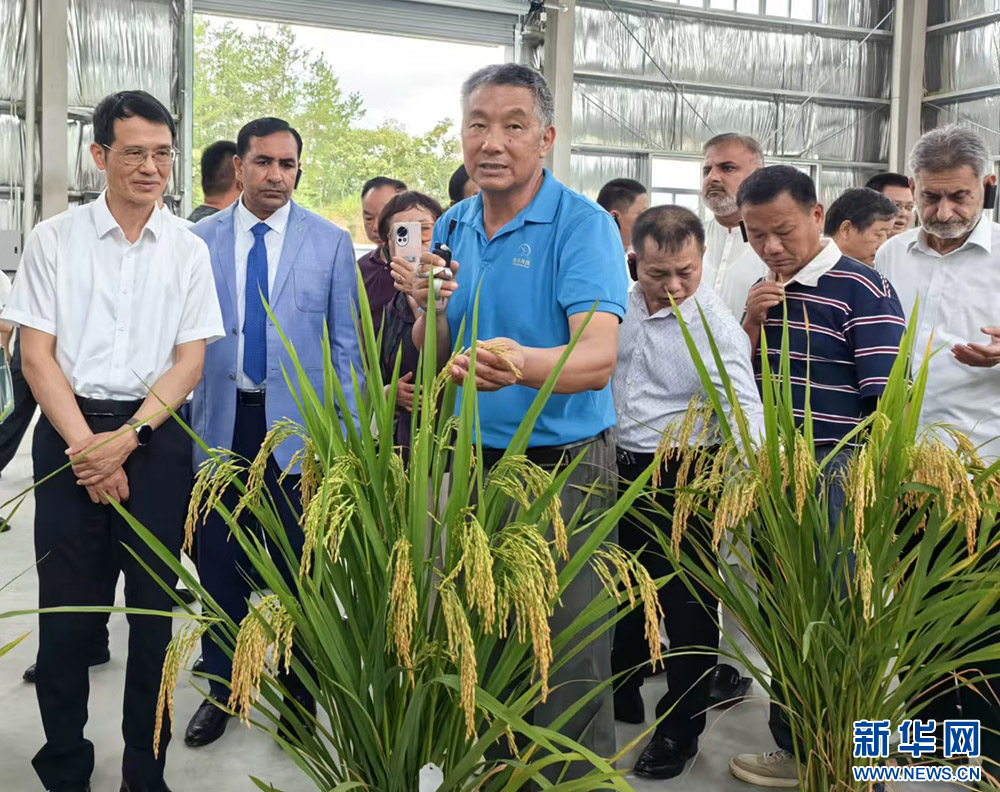 图为朱仁山(前排中)为国内外嘉宾介绍杂交水稻新品种。新华网刘晓丽摄