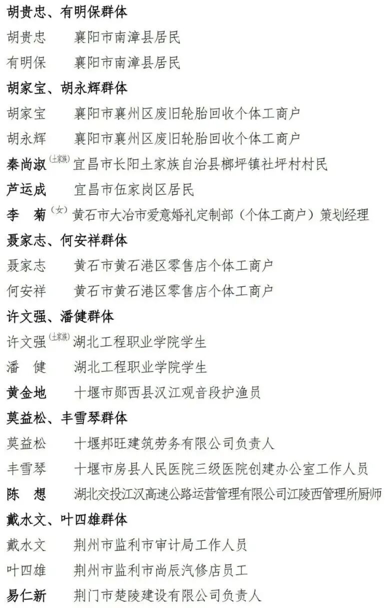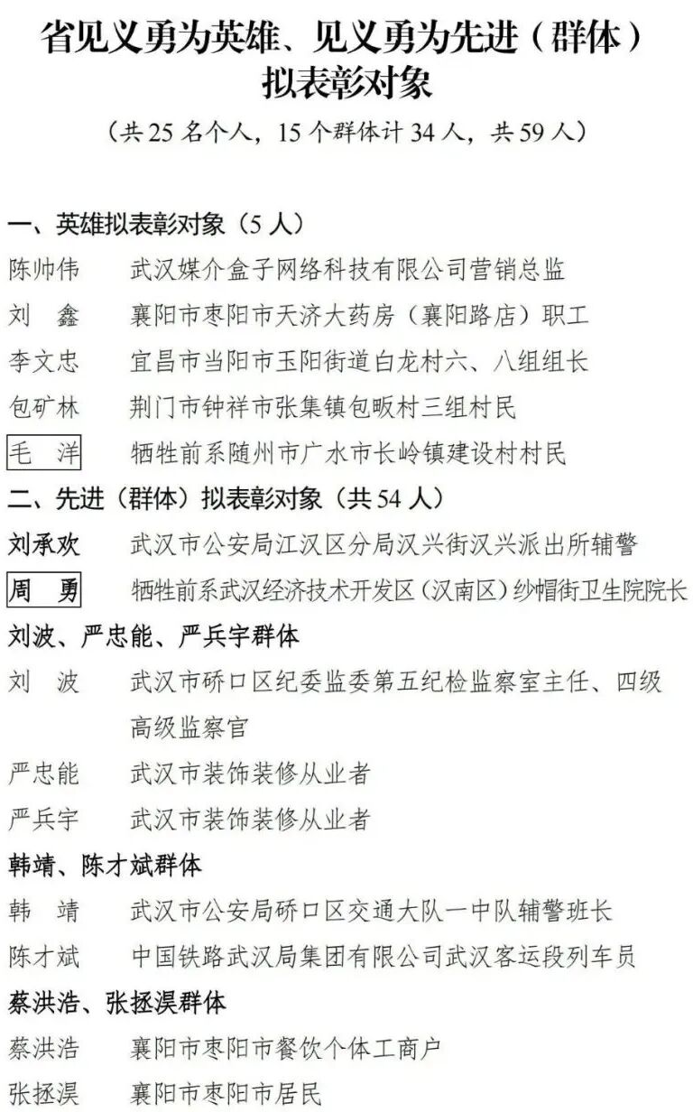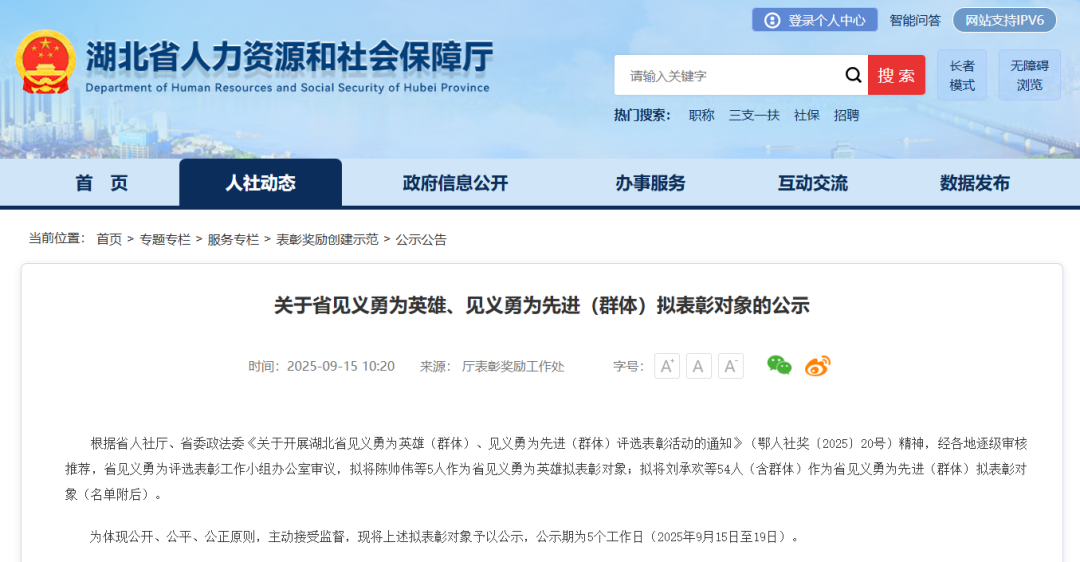 根据省人社厅、省委政法委《关于开展湖北省见义勇为英雄(群体)、见义勇为先进(群体)评选表彰活动的通知》(鄂人社奖〔2025〕20号)精神,经各地逐级审核推荐,省见义勇为评选表彰工作小组办公室审议,拟将陈帅伟等5人作为省见义勇为英雄拟表彰对象;拟将刘承欢等54人(含群体)作为省见义勇为先进(群体)拟表彰对象(名单附后)。