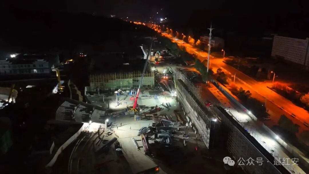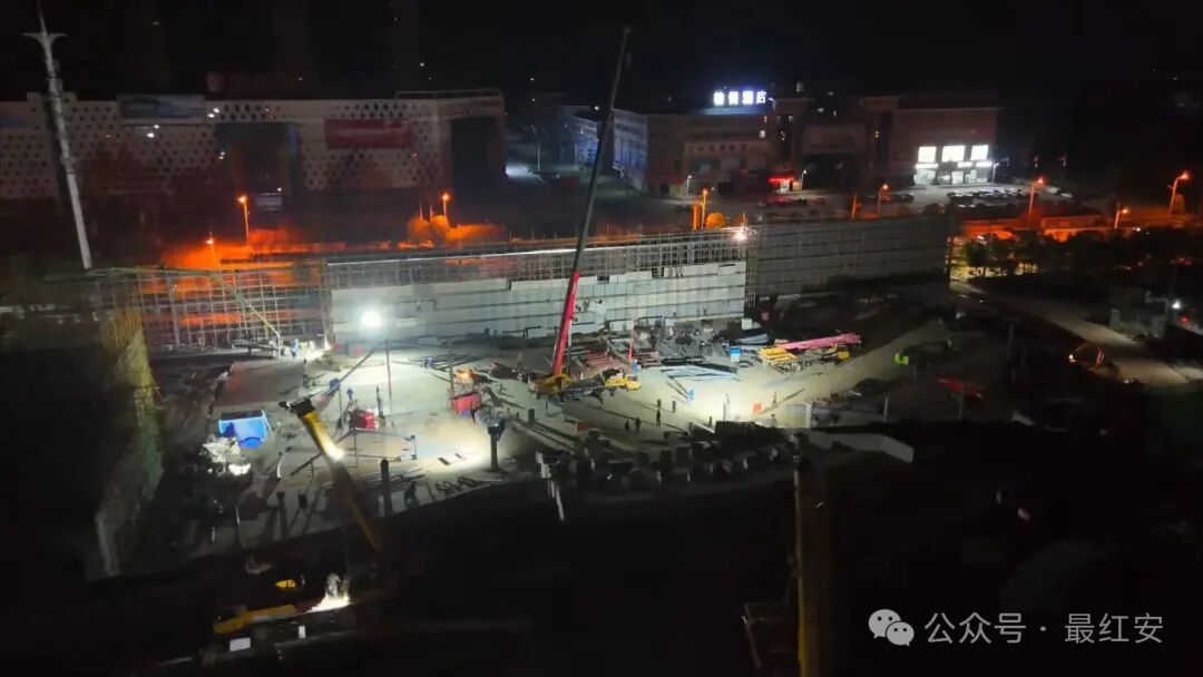 深夜 10 点,黄安古城红安影视幻城项目建设现场依旧灯火通明,机器轰鸣声与工人作业声交织,一派热火朝天的施工景象。为确保项目顺利推进,工人师傅们正加班加点奋战在建设一线,用汗水浇筑着红安文化旅游新地标。